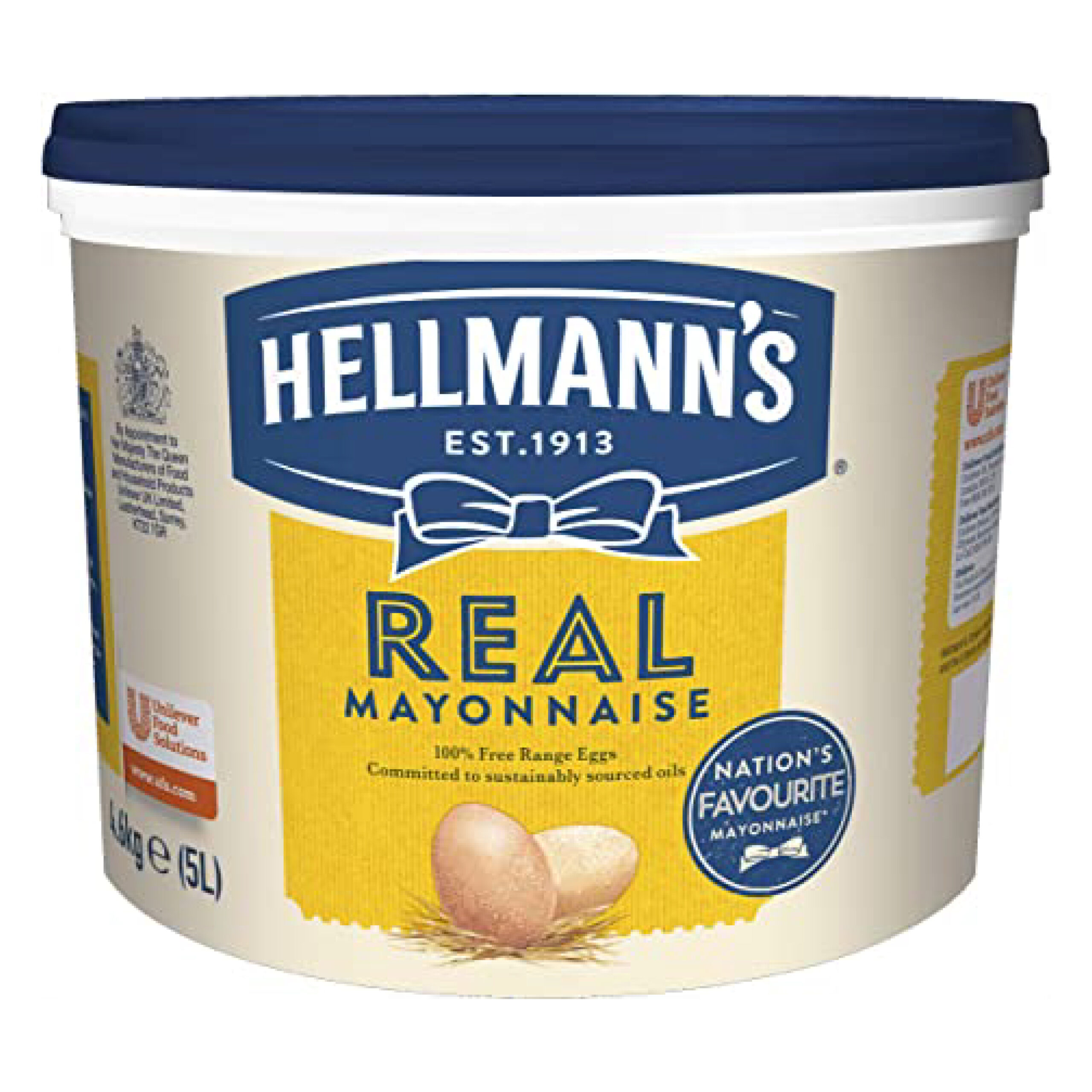 Real mayonnaise by Hellmann’s. Perfect for dipping fries, topping burgers and binding coleslaw as well as sandwiches and salads. The mayonnaise is a good natural source of Omega3. • Each case contains one individual 5ltr tub. • Sold in a plastic tub. • Each 5ltr tub provides approx. 330 portions. • The recommended portions size is 15g.